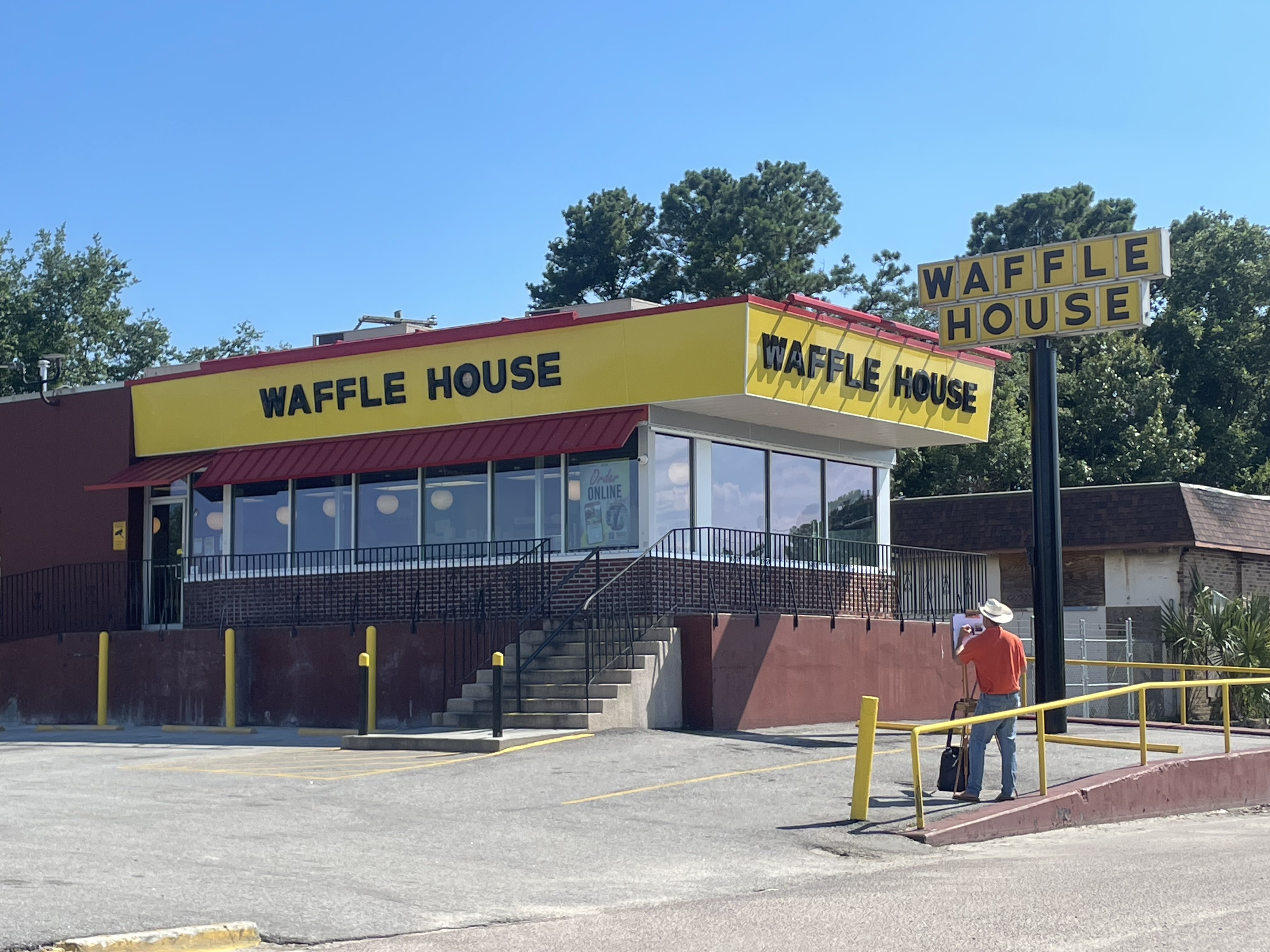 Yes: apparently, in the afternoon, somewhere in the South, a man in a cowboy hat decided to set up an easel in a Waffle House parking lot and paint the building. I have very little to say about it. Just... look at it. It's beautiful.
